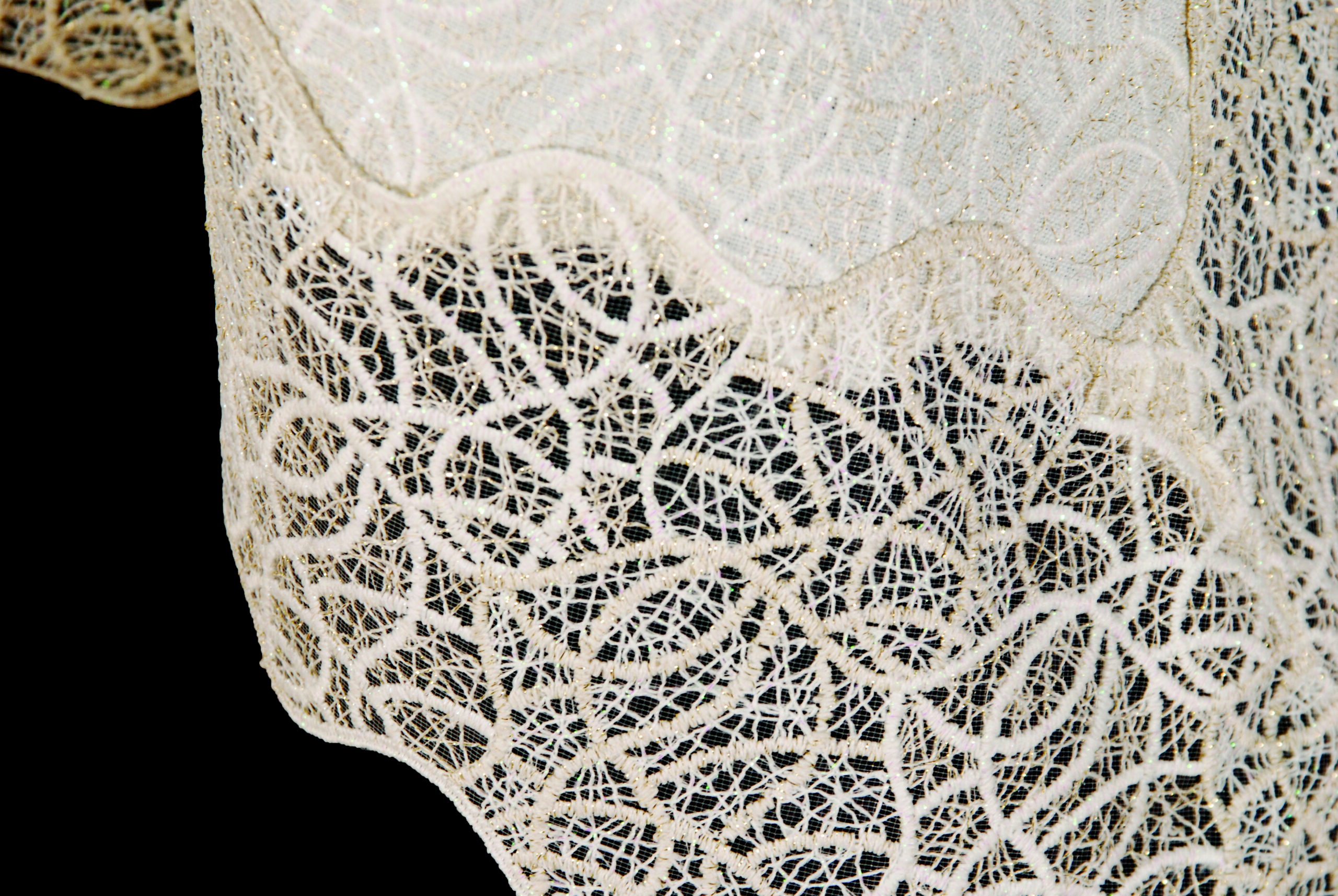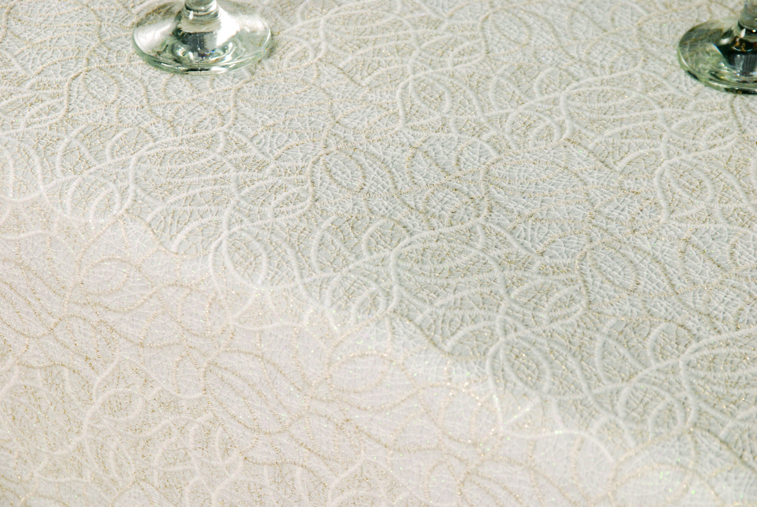 מפת שולחן עשויה בד פשתן איכותי, רקומה בדוגמת עיגולים שזורים בגווני שמנת וזהב עדין.